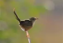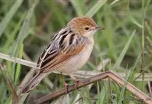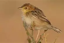 金头扇尾莺体小而具褐色纵纹的莺。嘴细长,略向下弯;翼短,体型娇小,尾长。下体皮黄,喉近白,尾深褐,尾端皮黄。雌雄羽色相近,羽色单调。繁殖期雄鸟顶冠亮金色,腰褐色。雌鸟及非繁殖期雄鸟头顶密布黑色细纹,…全部>>