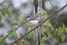 白喉林莺:体长10-13厘米,是一种类体型略小的莺鸟。喉白,上体灰褐或沙褐色,头顶较灰,贯眼纹黑褐或暗褐色。下体污白。耳羽深黑灰,胸侧及两胁沾皮黄色、褐色或淡粉红色。外侧尾羽羽缘白色。…全部>>