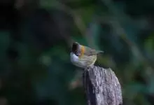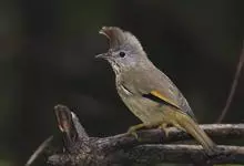纹喉凤鹛:小型鸟类,体长13-16厘米。头顶和羽冠暗褐色或褐灰色,上体橄榄褐色,飞羽黑褐色,外侧次级飞羽表面橙黄色,构成一块纵形翼斑,极为醒目。颏、喉淡棕白色,具黑色纵纹,腹和尾下覆羽橙黄色。…全部>>