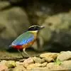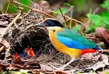 蓝翅八色鸫是雀形目八色鸫科的鸟类。体长17-20厘米,体重类约48-70克,体型圆胖,尾短,腿长,以身体具有红、绿、蓝、白、黑、黄、褐、栗等鲜艳夺目,丰富艳丽的色彩而得名,是很有观赏价值的鸟类。主要…全部>>