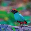 绿胸八色鸫:是雀形目八色鸫科的鸟类,共有12个亚种。体长为16-18厘米,体重65-69克。体型圆胖,尾短,腿长。头黑,上体绿色,两翼深色而具白色斑纹,头顶至后枕深褐,胸及腹部苹果绿,臀亮红。…全部>>
