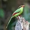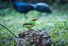 蓝绿鹊:中型鸟类,共有5个亚种。体长36-38厘米。尾长,嘴、脚红色。通体羽色主要为草绿色,宽阔的黑色贯眼纹向后延伸到后颈,在绿色的头侧极为醒目。两翅栗红色,内侧飞羽具黑色次端斑和白色尖端。尾绿色,…全部>>