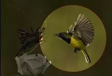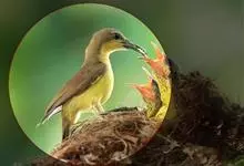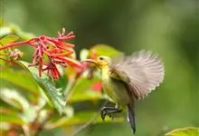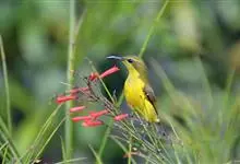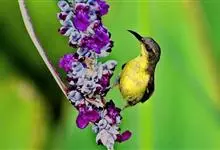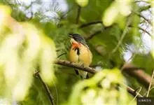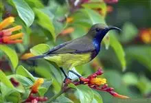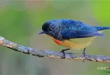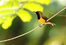 黄腹花蜜鸟是雀形目太阳鸟科花蜜鸟属鸟类。体型较小、喙略短而弯、腹部黄色。雄鸟繁殖季节颏及胸黑紫色并泛金属光泽,具有绯红色及灰色胸带,将上腹部黑色斑与前胸隔开,肩斑为橙黄色丝质羽,上体橄榄绿色,…全部>>