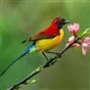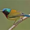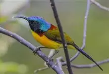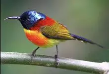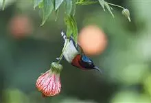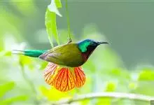绿喉太阳鸟:共有9个亚种。小型鸟类,雄鸟体长13-15厘米、雌鸟10-12厘米。雄鸟前额至后颈、颏和喉辉绿色,头侧黑色,颈侧和背暗红色,两肩、下背橄榄绿色,腰鲜黄色,尾上覆羽和中央尾羽暗绿色,…全部>>
