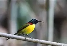黄腹花蜜鸟是雀形目太阳鸟科花蜜鸟属鸟类。体型较小、喙略短而弯、腹部黄色。雄鸟繁殖季节颏及胸黑紫色并泛金属光泽,具有绯红色及灰色胸带,将上腹部黑色斑与前胸隔开,肩斑为橙黄色丝质羽,上体橄榄绿色,…全部>>