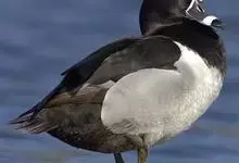 白眼潜鸭属中型潜鸭,个体比红头潜鸭小,和凤头潜鸭差不多。体长33-43厘米,体重0.5千克以上不到1千克。雄鸟头、颈、胸暗栗色,颈基部有一不明显的黑褐色领环;眼白色,上体暗褐色,上腹和尾下覆羽白色,…全部>>