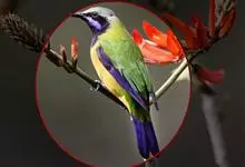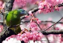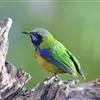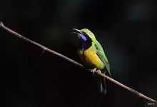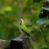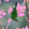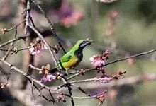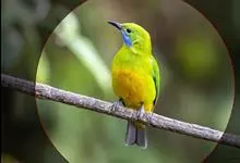 蓝翅叶鹎:小型鸟类,体长15-18厘米。雄鸟通体草绿色,尾蓝绿色,肩和翅亮蓝 色,胸缀有黄色,颏、喉黑色。雌鸟颏,喉蓝绿色。栖息在海拔1500米以下的常绿阔叶林、次生林和林缘疏林灌丛中。…全部>>