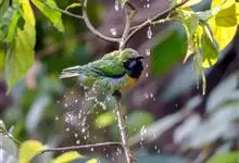 金额叶鹎是和平鸟科、叶鹎属的鸟类。体长16-20厘米。额和头顶前部金桔色,整个上体包括两翅表面草绿色。颏、喉黑色,其外围有一圈黄色,其余下体浅绿色,翼缘蓝紫色,翅上小覆羽翠蓝色。野外特征极明显,…全部>>
