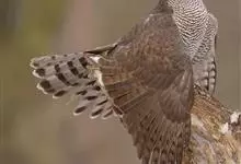 褐耳鹰的体形比苍鹰要小得多,为小型猛禽,体长为31-44厘米,体重217-325克。上体灰色,下体具赤褐色横斑。第6枚初级飞羽外羽片无缺刻,次外侧的4对尾羽具5道黑褐色横斑。眼先具白色短羽。…全部>>
