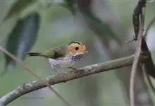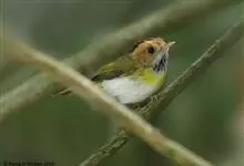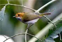 棕脸鹟莺:体长10厘米,是一种色彩亮丽而有特色的莺鸟。头栗色,具黑色侧冠纹。上体绿,腰黄色。下体白,颏及喉杂黑色点斑,上胸沾黄。与栗头鹟莺的区别在头侧栗色,白色眼圈不显著且无翼斑。…全部>>