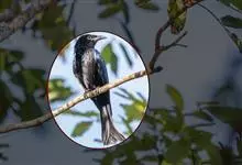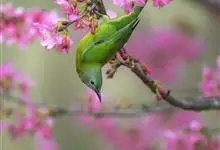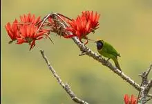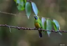 蓝翅叶鹎:小型鸟类,体长15-18厘米。雄鸟通体草绿色,尾蓝绿色,肩和翅亮蓝 色,胸缀有黄色,颏、喉黑色。雌鸟颏,喉蓝绿色。栖息在海拔1500米以下的常绿阔叶林、次生林和林缘疏林灌丛中。…全部>>