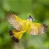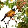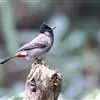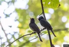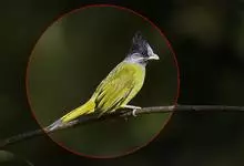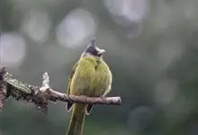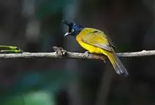 黑冠黄鹎:体长18-21厘米,是一种中等体型偏黄色鹎。整个头、颈、颏、喉黑色,头顶有显著直立的羽冠,黑色,上体褐橄榄黄绿色,下体橄榄黄色。虹膜偏红;嘴及脚黑色。…全部>>