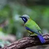 蓝翅叶鹎:小型鸟类,体长15-18厘米。雄鸟通体草绿色,尾蓝绿色,肩和翅亮蓝 色,胸缀有黄色,颏、喉黑色。雌鸟颏,喉蓝绿色。栖息在海拔1500米以下的常绿阔叶林、次生林和林缘疏林灌丛中。…全部>>