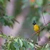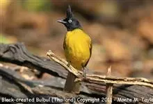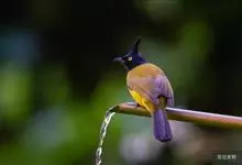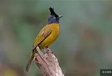 黑冠黄鹎:体长18-21厘米,是一种中等体型偏黄色鹎。整个头、颈、颏、喉黑色,头顶有显著直立的羽冠,黑色,上体褐橄榄黄绿色,下体橄榄黄色。虹膜偏红;嘴及脚黑色。…全部>>