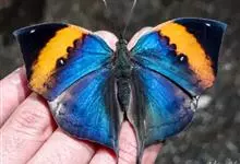 枯叶蛱蝶,又名木叶蝶、树叶蝶等,属于蛱蝶科。翅正面黑褐色,具深蓝色光泽,前翅顶角尖出,顶区有1枚小白点,中部有1条倾斜的橙色斑带,从前缘延伸至Cu室外缘,u室中部有1枚黑色圆斑,…全部>>