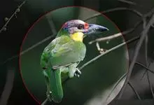 金喉拟啄木鸟,是须鴷科、拟啄木鸟属的鸟类。金喉拟啄木鸟为小型鸟类,体长19-24厘米。额深红色,头顶金黄色,后枕具一大块深红色斑,耳羽和头侧银灰色,上体草绿色,颏和上喉金黄色,下喉淡银灰色,…全部>>