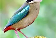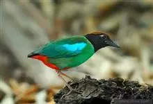 绿胸八色鸫:是雀形目八色鸫科的鸟类,共有12个亚种。体长为16-18厘米,体重65-69克。体型圆胖,尾短,腿长。头黑,上体绿色,两翼深色而具白色斑纹,头顶至后枕深褐,胸及腹部苹果绿,臀亮红。…全部>>