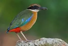 绿胸八色鸫:是雀形目八色鸫科的鸟类,共有12个亚种。体长为16-18厘米,体重65-69克。体型圆胖,尾短,腿长。头黑,上体绿色,两翼深色而具白色斑纹,头顶至后枕深褐,胸及腹部苹果绿,臀亮红。…全部>>