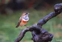 蓝点颏亦称“蓝喉歌鸲”,通称蓝靛颏儿。身体大小和麻雀相似,体长12-13厘米,体重17-18克。头部、上体主要为土褐色。眉纹白色。尾羽黑褐色,基部栗红色。颏部、喉部辉蓝色,下面有黑色横纹。下体白色。…全部>>