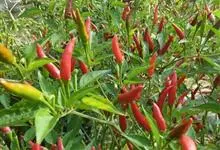 五色椒又名朝天椒,五彩辣椒,为辣椒 变种,味涩。属茄科多年生半木质性植物,常作一年生栽培;江苏沭阳一带有不少花农种植,其株高30厘米—60厘米,分枝多、茎直立,单叶互生;花白色,开花期5月初—7月…全部>>