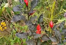 观赏辣椒,观赏辣椒根系发达,茎直立,茎部木质化,分枝能力强,分枝习性为双叉状分枝和三叉分枝。小果类型的植株高大,分枝多,大果类型的则相反。单叶互生,全缘,卵圆形,叶片大小、色泽与青果的大小色泽有相关性。…全部>>