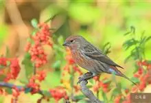 普通朱雀是雀形目雀科朱雀属鸟类,又名红朱雀、马料、青麻料。雄鸟上体红色,下体淡红色;头部、喉部、胸部及腰部亮红色;背部褐色染红色;两翼及尾黑褐色,羽缘染红色。雌鸟上体橄榄褐色,下体近白色,…全部>>