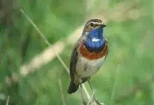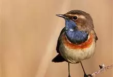蓝点颏亦称“蓝喉歌鸲”,通称蓝靛颏儿。身体大小和麻雀相似,体长12-13厘米,体重17-18克。头部、上体主要为土褐色。眉纹白色。尾羽黑褐色,基部栗红色。颏部、喉部辉蓝色,下面有黑色横纹。下体白色。…全部>>