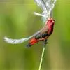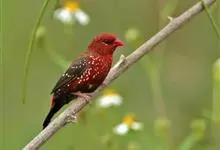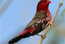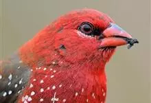 红梅花雀小型鸟类,体长9-10厘米。雄鸟通体朱红色,背、肩、胸等满布白色小斑点,两翅和尾黑褐色均具白色端斑,嘴红色,脚蜡黄色。雌鸟上体淡褐色或赭褐色,翅上中覆羽、大覆羽和内侧飞羽末端具白色斑点,…全部>>