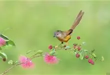 黄腹鹪莺:体长13厘米,是一种体型略大而尾长的橄榄绿色鹪莺。喉及胸白色,以下胸及腹部黄色为其特征。头灰,有时具浅淡近白的短眉纹;上体橄榄绿色;腿部皮黄或棕色。换羽导致羽色有异。繁殖期尾较短,…全部>>