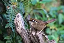 黄喉雀鹛是雀眉科、拟希鹛属小型鸟类,体长11-12厘米。头顶浅黄色具黑色鳞状斑,头顶两侧各有一道黑色侧冠纹,眉纹浅黄色、长而宽阔。上体灰绿色,两翅和尾褐色而具浅黄色窄缘。下体淡黄色。特征明显,…全部>>