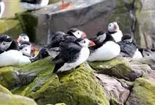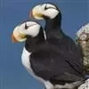 角海鹦:是鸻形目海雀科的鸟类,体重581-648克,体长约32厘米,翼展18-20厘米。是一种身体结实的鸟类,蹼脚、翅膀短,擅长游泳捕鱼,而在陆地上行走时则显得僵硬、步履蹒跚。有一张大嘴巴,呈三角形…全部>>