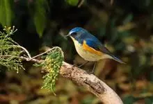 红胁蓝尾鸲俗名:蓝点冈子、蓝尾巴根子、蓝尾杰、蓝尾欧鸲。体型略小而喉白的鸲。特征为橘黄色两胁与白色腹部及臀成对比。雄鸟上体蓝色,眉纹白;亚成鸟及雌鸟褐色,尾蓝。…全部>>