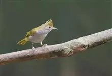 白腹凤鹛是绿鹃科、绿凤鹛属的小型鸟类,体长10-12厘米。上体从头到尾黄绿色,有短的羽冠,头顶微具黑色羽轴纹;眼先、眼周,耳羽和下体灰白色,尾下覆羽黄色。虹膜褐色或红褐色,上嘴浅褐色或肉褐色,…全部>>