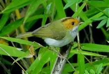 棕脸鹟莺:体长10厘米,是一种色彩亮丽而有特色的莺鸟。头栗色,具黑色侧冠纹。上体绿,腰黄色。下体白,颏及喉杂黑色点斑,上胸沾黄。与栗头鹟莺的区别在头侧栗色,白色眼圈不显著且无翼斑。…全部>>