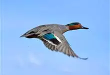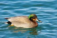 绿翅鸭是小型鸭类,体长37厘米,体重约0.5千克。嘴脚均为黑色。雄鸟头至颈部深栗色,头顶两侧从眼开始有一条宽阔的绿色带斑一直延伸至颈侧,尾下覆羽黑色,两侧各有一黄色三角形斑,在水中游泳时,极为醒目。…全部>>