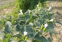 曼陀罗,茄科曼陀罗属一年生大型草本植物,全株光滑。有臭气;叶呈广卯形,边缘具不规则波状浅齿裂;花单生于枝杖间或叶腋,直立,有短梗;花萼是筒状裂片三角形,颜色为白色或淡紫色;果实为蒴果卵状,…全部>>