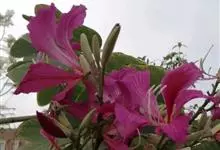 羊蹄甲,别名紫花羊蹄甲、玲甲花,是豆科羊蹄甲属的一种常绿乔木或灌木。树冠开展,枝桠低垂;树皮灰色至暗褐色,近光滑。枝幼时微被灰色短柔毛,后毛脱落;叶硬纸质,近圆形,基部浅心形,…全部>>