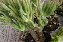 筒叶花月,是景天科青锁龙属的多年生草本植物。植株多分株,灌木状,茎较粗壮,圆柱形,表皮灰褐色;叶片肉质,互生,呈圆筒状,簇生于茎或分枝顶端,叶端呈斜截形,截面为椭圆形;花呈星状,淡白色;花期秋季。…全部>>