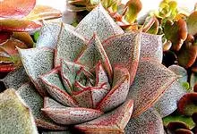 大和锦是景天科拟石莲花属的多肉植物。肉质叶排成紧密的莲座状,广卵形至散三角卵形,背面突起呈龙骨状,叶长3至4厘米,宽约3厘米,先端急尖。叶色灰绿,密布红褐色的斑纹。花序高约30cm。小花红色,上部黄色。…全部>>