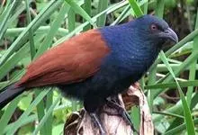 褐翅鸦鹃,是鹃形目鸦鹃科鸦鹃属的鸟类。褐翅鸦鹃的身体为黑色;头颈和胸带蓝紫色金属光泽并具黑亮的羽干纹,下胸至腹部泛金属绿光泽;两翼和肩部为棕栗色,外侧飞羽具暗色羽端,尾羽闪铜绿色光泽;虹膜赤红色,…全部>>