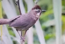 白颊噪鹛是雀形目噪鹛科噪鹛属鸟类,又称土画眉、小画眉、小噪鹃。成鸟额至头顶栗褐色,长眉纹、眼先和颊纹棕白色,眼后至耳羽深褐色,…全部>>