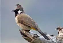 白颊鹎是雀形目鹎科鸟类。体长19—21厘米。雌雄相似。成鸟头部深灰色具一显著的羽冠,白色脸侧具一黑色点状斑纹。颏部、喉部黑色;胸部、腹部、两胁近白色;背部、两翼近灰色;尾下覆羽黄色,尾羽灰色,…全部>>
