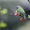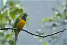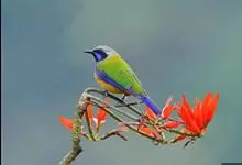 蓝翅叶鹎:小型鸟类,体长15-18厘米。雄鸟通体草绿色,尾蓝绿色,肩和翅亮蓝 色,胸缀有黄色,颏、喉黑色。雌鸟颏,喉蓝绿色。栖息在海拔1500米以下的常绿阔叶林、次生林和林缘疏林灌丛中。…全部>>