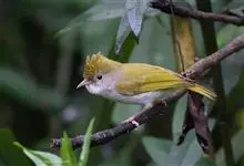 白腹凤鹛是绿鹃科、绿凤鹛属的小型鸟类,体长10-12厘米。上体从头到尾黄绿色,有短的羽冠,头顶微具黑色羽轴纹;眼先、眼周,耳羽和下体灰白色,尾下覆羽黄色。虹膜褐色或红褐色,上嘴浅褐色或肉褐色,…全部>>