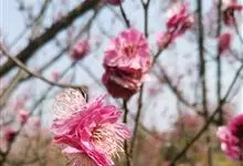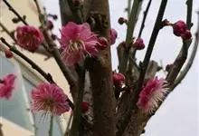 宫粉梅 Rehd.)是蔷薇科、李属植物,梅花品系中真梅系直枝梅类宫粉型,其花复瓣至重瓣,呈或深或浅的红色。落叶乔木,高达10米。树干褐紫色,有纵驳纹,小枝细而无毛,多为绿色。叶广卵形至卵形,…全部>>