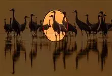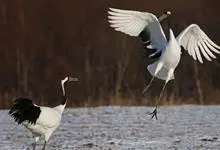 丹顶鹤:是鹤科、鹤属的一种大型涉禽,体长120-160厘米。颈、脚较长,通体大多白色,头顶鲜红色,喉和颈黑色,耳至头枕白色,脚黑色,站立时颈、尾部飞羽和脚黑色,头顶红色,…全部>>