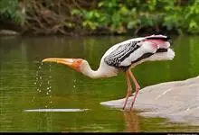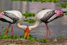 彩鹳:鹳科、鹮鹳属的鸟类。体长93-102厘米,体重2-3.5千克。橙黄色的嘴粗而长,但嘴尖稍微向下弯曲。脚为红色,也特别长,胫的下部裸出。橙色的头部赤裸无羽,繁殖期变为红色。体羽主要为黑色和白色,…全部>>