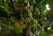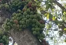 大果榕是桑科榕属的小乔木,株高可达10米;幼枝被柔毛;叶互生,宽卵状心形或近圆形;雄花无梗、匙形、花丝长,雌花生于雌株榕果内,子房白色;榕果簇生于树干基部或老茎短枝上、扁球形或陀螺形,…全部>>