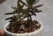 棒叶落地生根是景天科、落地生根属植物。茎直立、粉褐色。叶圆棒形,上表面有沟、粉色,有红褐斑。叶片交互对生,交叉排列成十字形。叶端锯齿上长有很小的幼株、落地后即可生根成活。原产非洲马达加斯加。…全部>>