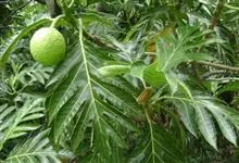 面包树 Fosberg)是桑科波罗蜜属植物。叶大,成熟之叶羽状分裂,表面深绿色,背面浅绿色;穗状花序单生叶腋,雄花序长圆筒形至长椭圆形或棒状;聚花果倒卵圆形或近球形;花期为3~5月,果期为7~10月。…全部>>